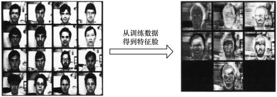 另外,在人脸识别领域中,PCA 和LDA 都会被频繁使用。基于PCA 的人脸识别方法也称为特征脸(Eigenface)方法,该方法将人脸图像按行展开形成一个高维向量,对多个人脸特征的协方差矩阵做特征值分解,其中较大特征值对应的特征向量具有与人脸相似的形状,故称为特征脸。Eigenface for Recognition 一文中将人脸用7 个特征脸表示(见图4.7),于是可以把原始65536 维的图像特征瞬间降到7 维, 人脸识别在降维后的空间上进行。然而由于其利用PCA 进行降维,一般情况下保留的是最佳描述特征(主成分),而非分类特征。如果我们想要达到更好的人脸识别效果,应该用LDA 方法对数据集进行降维, 使得不同人脸在投影后的特征具有一定区分性。