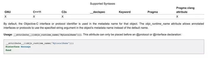 这个属性可以用来做代码混淆,例如写一个宏定义,宏定义内部实现混淆逻辑。例如通过MD5对Object做混淆,32位的混淆结果就是497031794414a552435f90151ac3b54b,谁能看出来这是什么类。如果怕彩虹表匹配出来,再增加加盐逻辑。