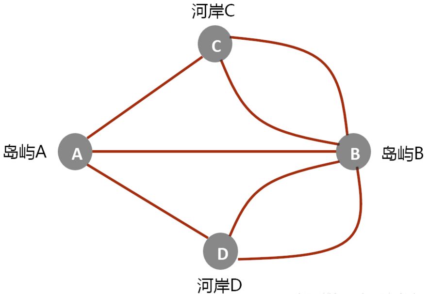 很明显,上图中 A、C、D 三个顶点相连的边都有 3 条,B 顶点的相连边为 5 条,都是奇数。因此这个图无法从一个顶点出发,且恰好走过每座桥一次。