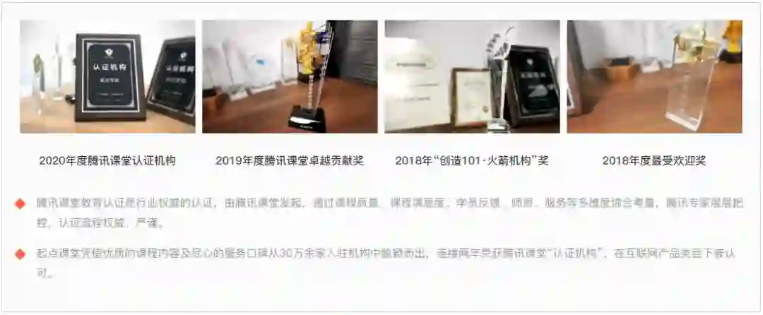 起点课堂和腾讯课堂维持长期的战略合作,起点课堂凭借优质的课程内容及尽心的服务口碑从2万余家入驻机构中脱颖而出,连续6年荣获腾讯课堂“认证机构”,也是互联网产品类目下的唯一 一家被认可的机构。