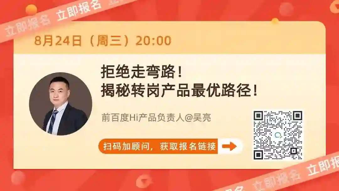 8月24日(周三)晚上8点,前百度Hi产品负责人@吴亮老师 在线直播,教你如何避开转岗产品的大坑,助你提高转岗成功率!