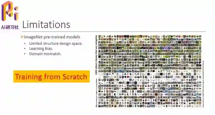ImageNet预训练模型的限制:一是模型结构是固定的,你不可能改变它的结构,二是会有learning bias,三是会出现domain不匹配的情况。我们的思路是从头训练检测器,但是我们用R-CNN和Faster-RCNN都没能得到较好的表现。