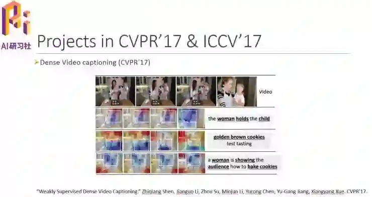 最后简单介绍下我们在CVPR 2017的相关工作Dense Video captioning,主要是做视频描述。在视频当中包含很多内容,而这些内容并不一致,因此视频描述相对来说会比较困难。下图是一些示例。
