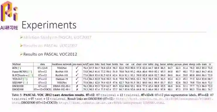 下面是在PASCAL VOC2012上的实验结果,可以看到DSOD有不错的mAP值。