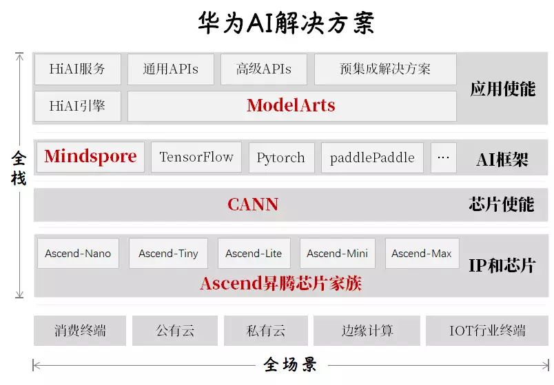 “全栈”指的是包括强大算力的高性能AI芯片、芯片使能、AI推理和训练框架和应用使能在内的全堆栈方案;