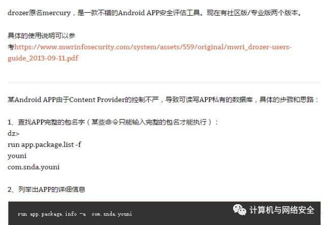 Drozer – Android APP安全评估工具(附测试案例):http://www.maxwithcoco.com/notes/mobile-sec/apk-drozer-contentprovider
