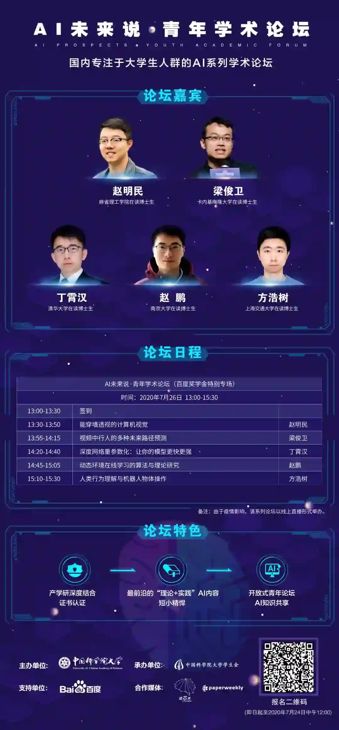 “AI未来说·青年学术论坛”系列讲座由中国科学院大学主办,承办单位为中国科学院大学学生会,协办单位为中国科学院计算所研究生会、中科院计算机网络信息中心研究生会、人工智能学院学生会、化学工程学院学生会、公共政策与管理学院学生会、微电子学院学生会、数学与系统科学研究院研究生会,百度为支持单位,读芯术、PaperWeekly为合作自媒体。“AI未来说·青年学术论坛”第17期百度奖学金专场将于2020年7月26日13:00-15:30线上举行。