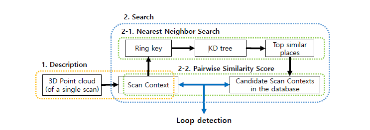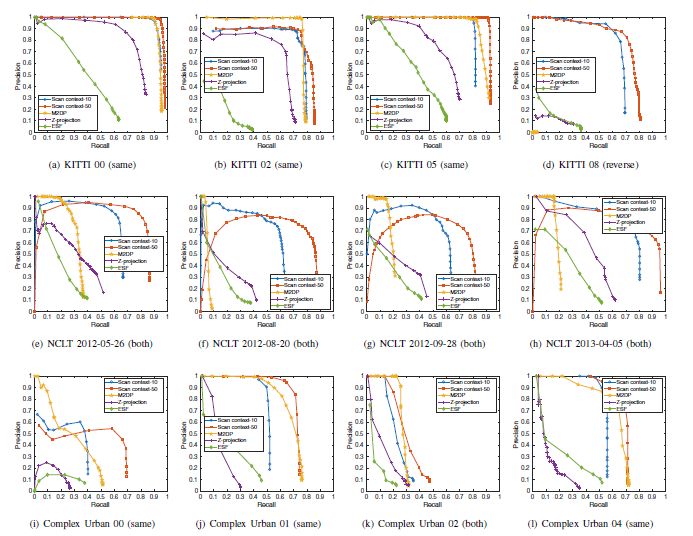 与使用点云的现有全局描述符相比,扫描上下文在各种数据集中显示出更高的环路检测性能。