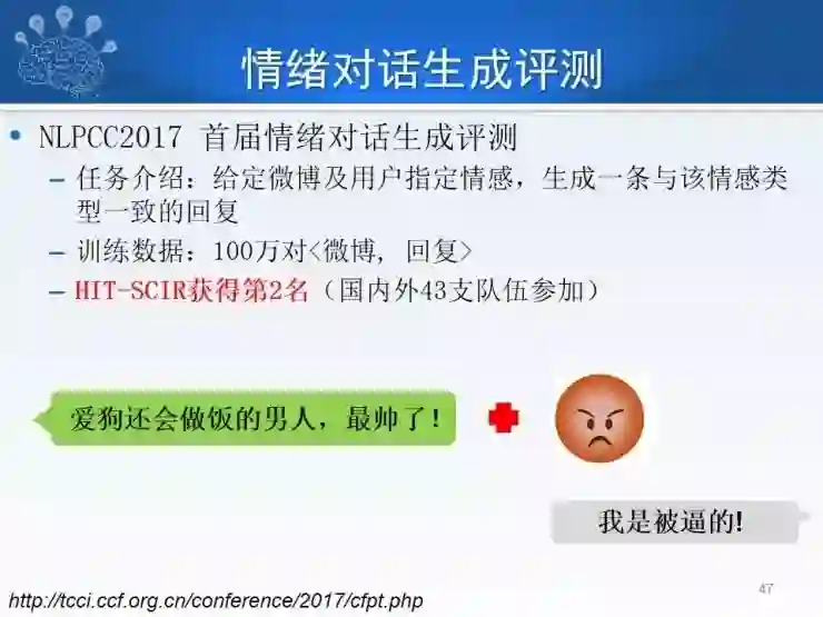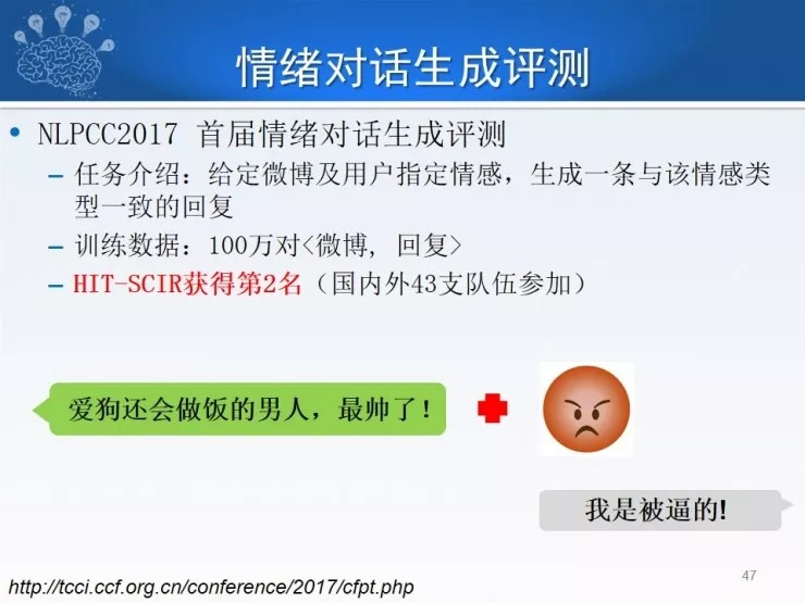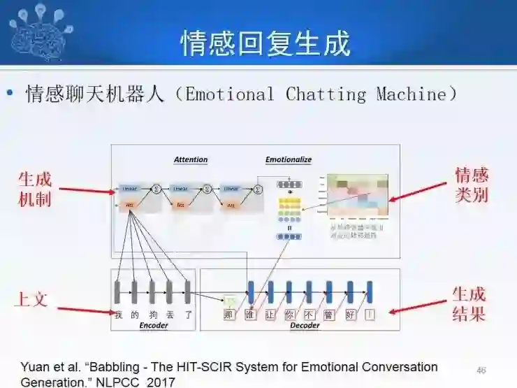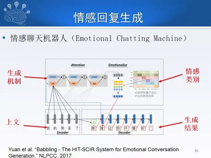 实际上我们一直分析的是人类的情感,我们一直很期待机器是不是能产生情感,也就是说机器有情感吗?有三观吗?目前机器是没有自主意识的,而指定情感类别的情感生成可以做到,比如说我们可以根据指定的情感类别生成情感表达,也可以在聊天机器人当中根据转移概率进行变换,此外也可以对情感表达进行润色和风格转换。