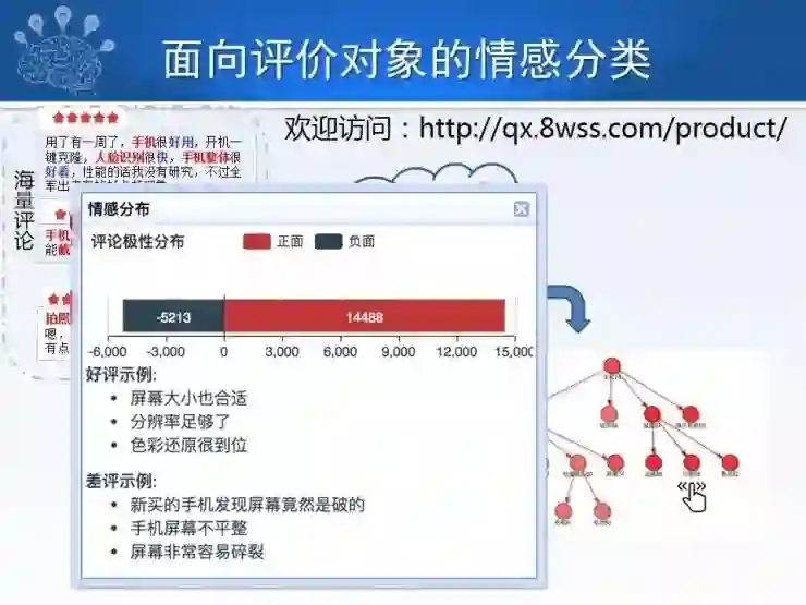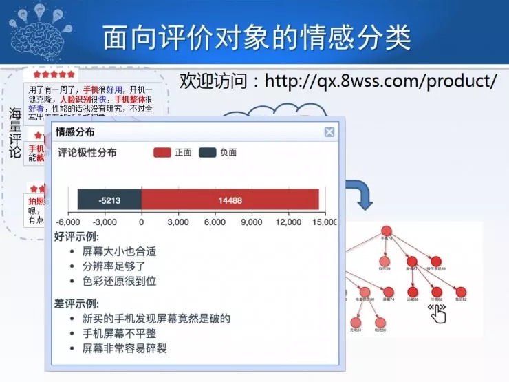 面向评价对象的情感分类,可以落地很多应用,比如现在网络上有很多文本,海量的评论,比如评论手机,具体来讲是华为手机,我们在评论时按照细粒度分类,可以把评价对象、评价词、属性抽取出来,进一步构建出评价手机体系的维度空间,也就是说你可能事先对某一个产品或某一个分类不知道从哪些角度去了解它,或者从哪些维度去分析它,但我们可以通过细粒度情感分类把这个体系归纳出来,同时对每一个粒度进行打分,比如图中红色和蓝色的区别就是褒贬,颜色的不同表示它们打分值,这样用户可以在购买时进行评价,比如华为手机、苹果手机或其他类型的手机。