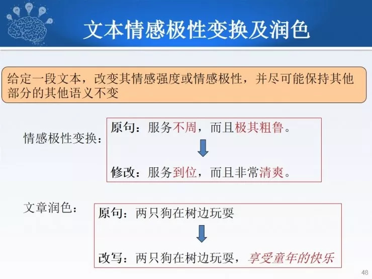 此外,我们可以进行文本的情感极性变换及润色,比如原句是“服务不周,而且极其粗鲁”,可以修改为“服务到位,而且非常清爽”。还可以进行文章的润色,比如“两只狗在树边玩耍”,我们可以把它修改为“两只狗在树边玩耍,享受童年的快乐”。