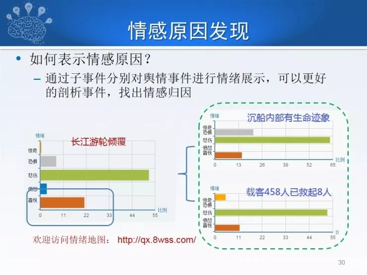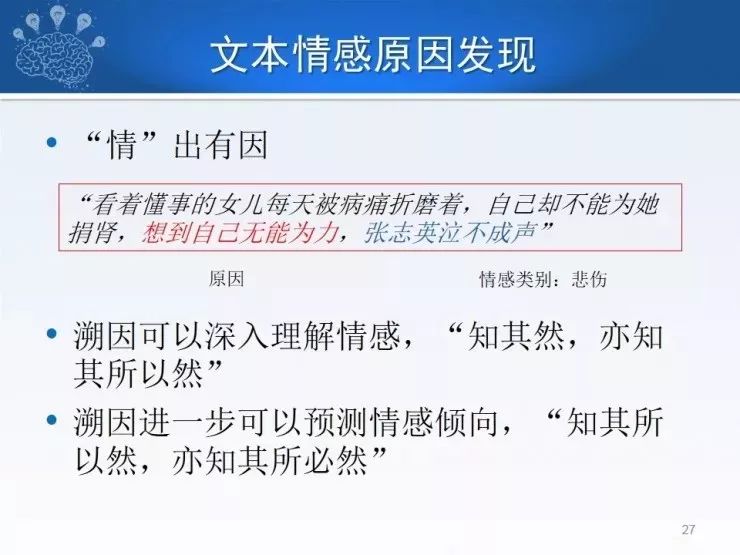 分析情感的目的是什么?这些情感产生的原因又是什么?比如他是因为什么高兴、因为什么伤心、因为什么愤怒,我们需要情感溯因,也为了大家更好地观察产品、体会服务以及体察对方的情感。从原因来看,一般是“情”出有因,这里有一个例子看着懂事的女儿每天被病痛折磨着,自己却不能为她捐肾,想到自己无能为力,张志英泣不成声”。我们可以进行溯因,也就是要知其然,也要知其所以然,知道了原因之后,比如你知道一个人有洁癖,忍受不了桌子上有一层灰,下次她再看到一个地方的桌子上有一层灰,可能她没有表达出来,但你能预期到她会生气。