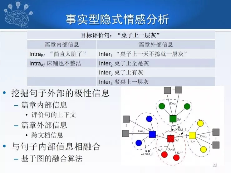 这种事实型描述怎么挖掘?这种事实型表述出现很频繁,这个时候我们可以采用上下文,比如我说“桌子上有一层灰,很不高兴”,就可以把“桌子上有一层灰”定义为贬义的。或者找不到上下文的话,也可以在其他文当中找到跟它相似的语句,再判定情感,通过借助周围上下文的分析进行推理,得到这句话的情感,这是一种解决策略。同时,我们也可以借助某种知识,比如快递多长时间算快,或者说这个人身高1.8米,我们有个常识,一米几以上就算高个儿,类似这样的知识可以帮助我们进行隐式情感分析。