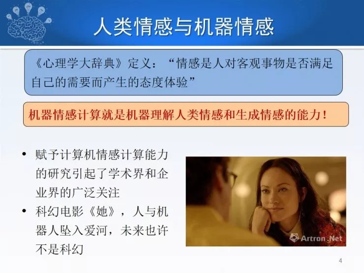 何为情感?严格定义来讲就是情感是人对客观事物是否满足自己需要而产生的态度体验。机器对于情感的要求就是机器情感计算,也就是机器理解人类的情感和生成情感的能力。所以赋予计算机情感计算能力的研究引起了学术界和企业界的广泛关注。很多人都看过电影《她》,人机恋爱出现在科幻电影中,未来也许会出现在我们的生活当中。