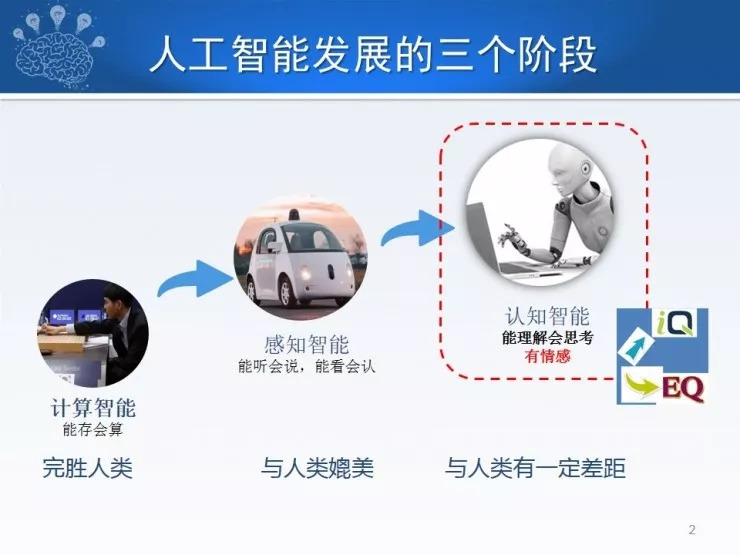 大家也知道,人工智能目前已进入迅猛发展阶段,总体可以分为三个阶段,第一个阶段是计算智能的阶段,这个阶段计算机和人类相比是能存会算,它的超大存储量、超高计算速度,这方面完胜人类。第二个阶段是感知智能,以语音识别、图像识别为代表的技术迅猛发展。大家也看过很多电视节目,包括“机智过人”、“最强大脑”;人和机器比图象识别,机器已经可以和人类相媲美甚至在某些方面超过人类。第三个阶段是认知智能,这个阶段需要机器能够思考,能够具有情感,这个阶段考验的是智能是否有情商,也就是说情感在人工智能认知阶段还是非常重要的。