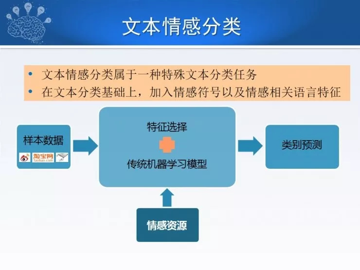 有了这么多类别体系,又有倾向性分类或情绪分类,分别针对我们对不同的产品、不同的服务,甚至表达的是我们个人的不同情感,无论它怎么划分或者划分的颗粒度有多细,总体来讲它是一个分类任务,也就是说传统的文本分类任务适用于情感分类,文本的情感分类可以看成是一种特殊的文本分类任务。那么传统文本分类是通过训练样本、特征提取+机器学习模型,训练好参数,对未知样本进行分类预测。对于情感分类,考虑到特定的情感资源,相对于传统文本分类,有了更多可利用的知识。