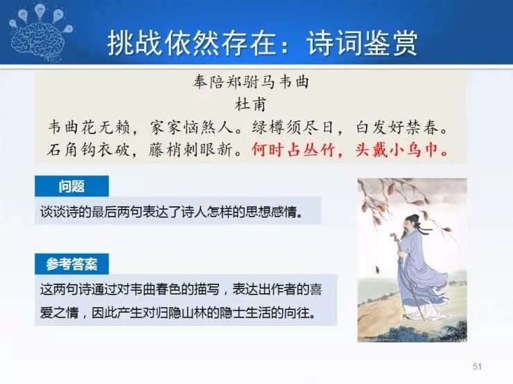 我们来看一下能否进行诗词鉴赏。例如一个高考题目,关于一首杜甫的诗,“韦曲花无赖,家家恼煞人”,描写春色的美。“绿樽须尽日,白发好禁春”是说在这样的日子需要喝酒,需要好好享受春天的气息。“石角钩衣破,藤梢刺眼新”描述他已经不顾衣服被石角钩破,欣赏藤梢冒出的新芽。“何时占丛竹,头戴小乌巾”表达什么时候能头戴小乌巾归隐山林。问题是谈谈诗的最后两句表达了诗人怎样的思想感情。参考答案是对于春色的描述表达出作者的喜爱之情,因此产生对归隐山林的隐士生活的向往。情感分析中用了很多其他技术,包括古诗词、隐喻等等,能表达情感和背后隐藏的归隐山林的心情,什么时候·机器的情感分析也能进一步分析出这种情感,同时又能像刚才孙茂松老师介绍的古诗词一样,能够生成带有指定情感的古诗词也是情感分析未来需要探索的。