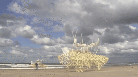 荷兰动感雕塑艺术家Theo Jansen发明的风力仿生兽Strandbeests