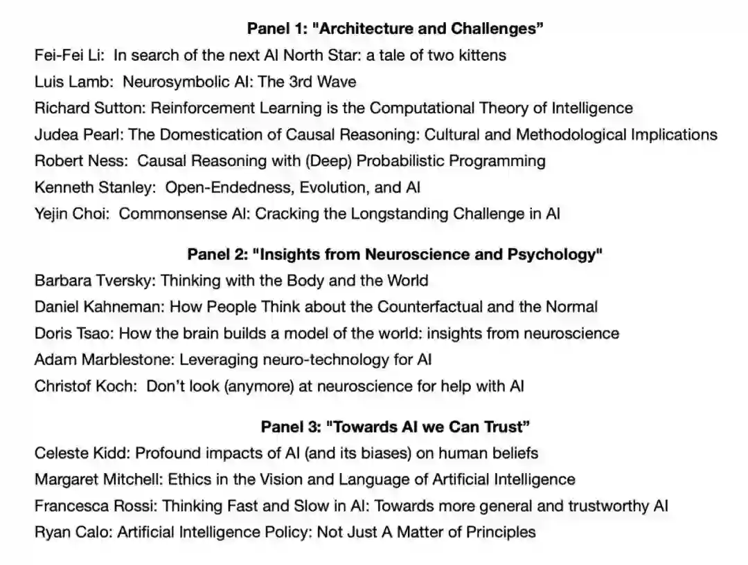 首先是第一个主题「架构与挑战」。参与讨论的学者有:Yejin Choi、Luis Lamb、Fei-Fei Li、Robert Ness、Judea Pearl、Ken Stanley 和 Rich Sutton。