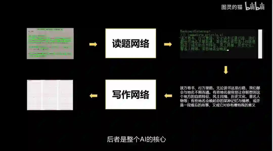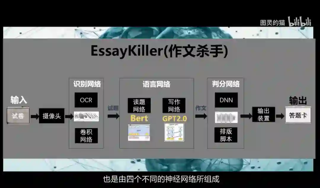 EssayKiller 用它骄傲和自豪的 17 亿神经网络参数的多模块异构深度神经网络,通过 UP 主编写的高考格式排版脚本,搭配改装后的外接装置,对文本进行实时输出,在规定时间内将作文誊写到答题卡上。