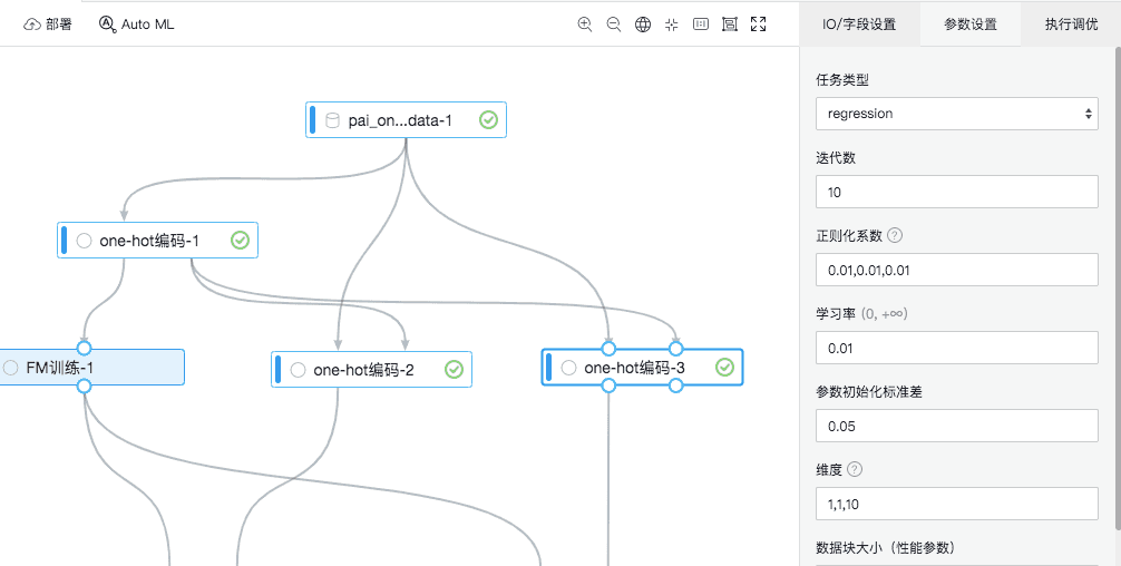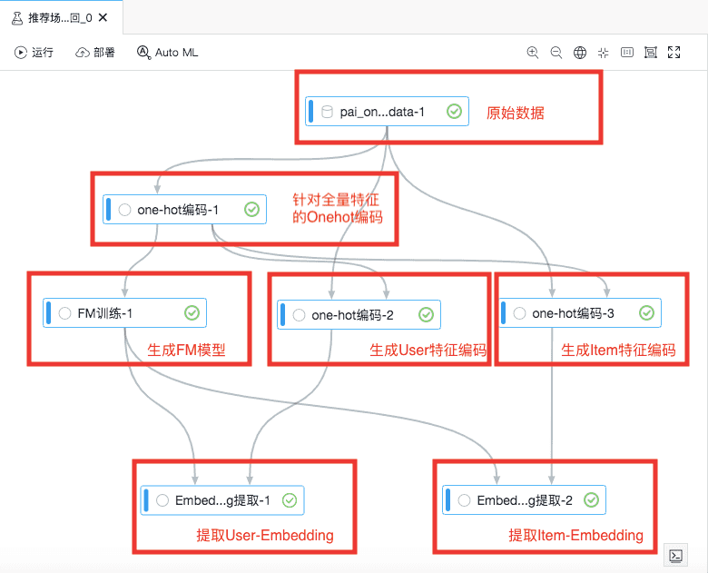 One-hot编码可以将字符型数据转成数值型表示,在FM-Embedding方案中首先利用“onehot编码-1”针对全量数据进行编码,生成编码模型再输入到“onehot编码-2”和“onehot编码-3”中,“onehot编码-2”需要选择User对应的特征信息进行编码,“onehot编码-3”选择Item对应的特征信息进行编码。