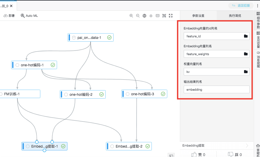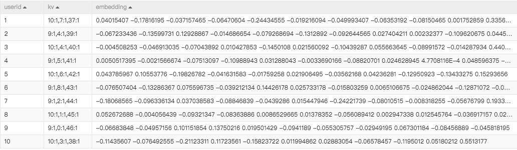 Embedding向量列名:输入左桩FM训练中的模型的“feature_weights”