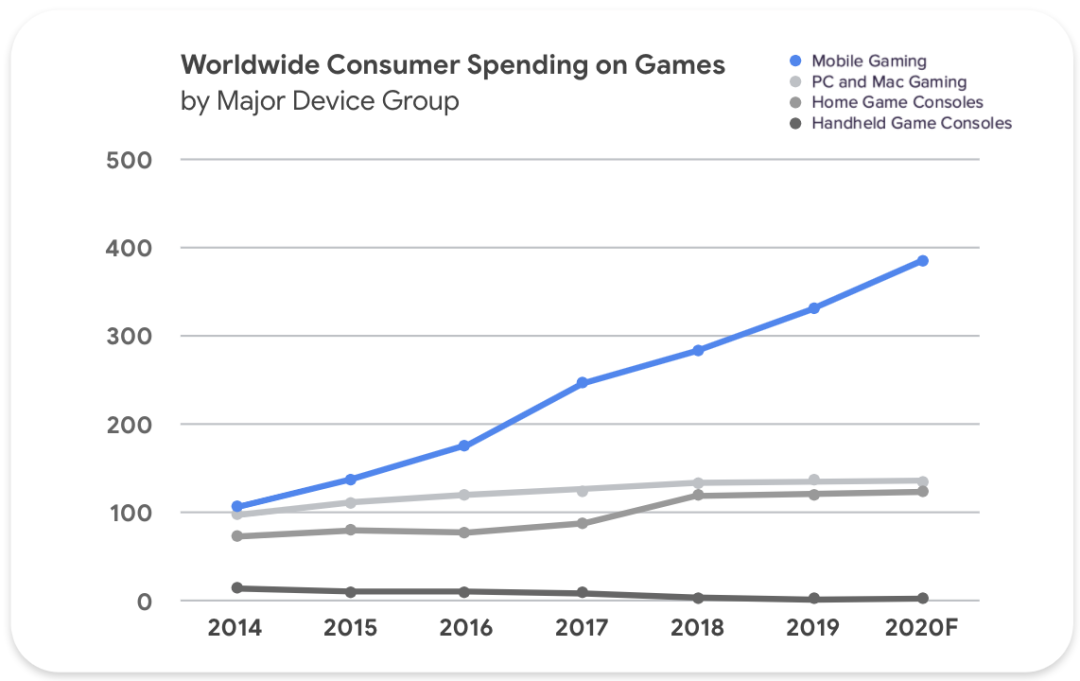 预计到 2020 年底,游戏行业中的移动游戏的消费者支出将持续占据领先地位