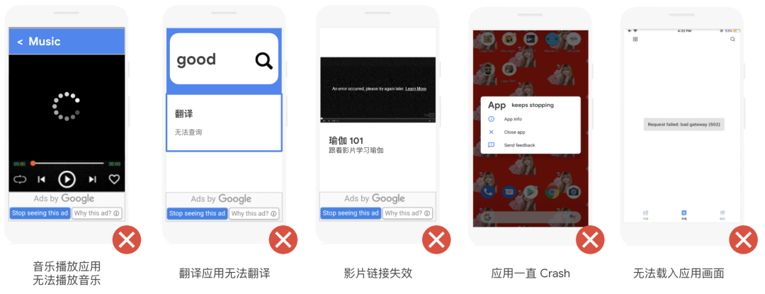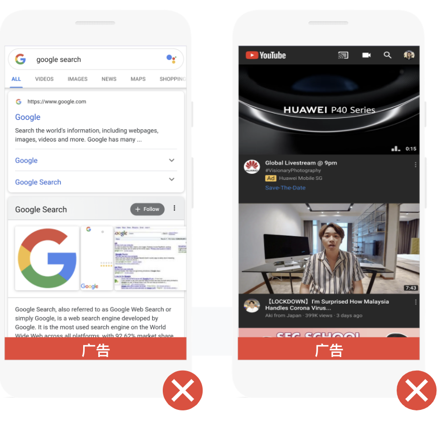 任何情况下,横幅广告都不可以覆盖或过于靠近任何应用内容,不可以放在应用内容之间就算是认为较不重要的内容也尽量避免。应用内容或元素在任何情况下不能覆盖或太过靠近广告