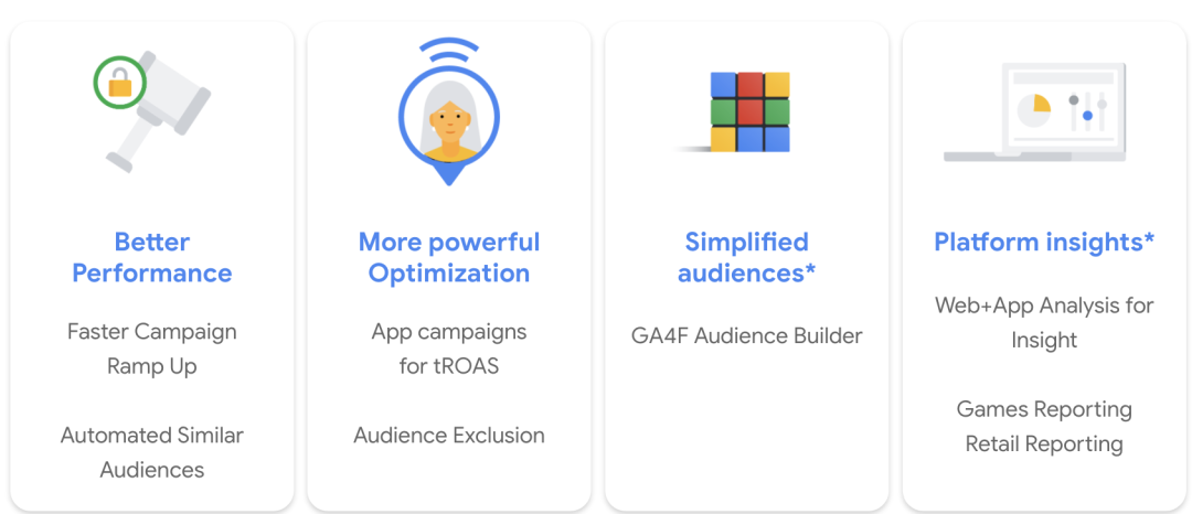 Firebase 除了对现有功能的优化之外,其实也会推出一系列新的功能。Automated Similar Audiences,就是基于 Firebase 的数据自动找到并生成高价值用户的列表。具体使用上,就是在投放 AC 2.5 的时候选用 Firebase 事件作为优化目标,Firebase 的后台会自动利用收集到的第一手数据甄别可能会触发目标事件的用户,将这些用户实时的分享给 Google Ads,从而使机器学习更高效,广告投放更加精准。