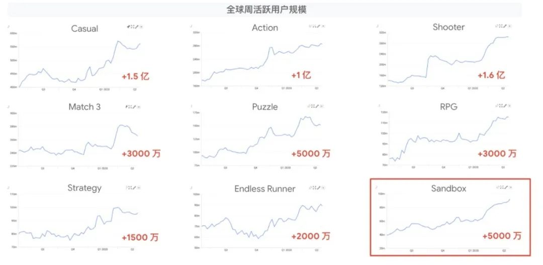 "宅经济" 兴起后,移动游戏与应用的全球活跃用户相较于去年已经有了飞跃式的增长,孕育了巨大的新机遇。以 Health & Fitness 为例,这个曾经逐渐成熟平稳的领域,因为 "宅经济" 影响迎来了新的发展契机。游戏领域亦是如此,2020 年全球周活跃用户规模较上一年增长 10 亿,一系列细分赛道的量级都得到了显著的扩充。相对小众的级别也有跨越式用户量级的提升。