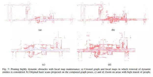 图7 在本地地图维护下运行高度动态的障碍物。a)创建的图和局部地图,其中考虑了动态实体的移除。b)投影在计算图形上的原始激光扫描。c)和d)放大高迁移率的人的区域