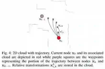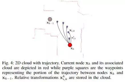 图4 带有轨迹的2D云。 当前节点xk及其相关联的云用红色描绘,而紫色方块是表示节点xk和xk-1之间的轨迹部分的路径点。 相对变换xki,k存储在云中