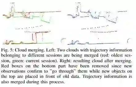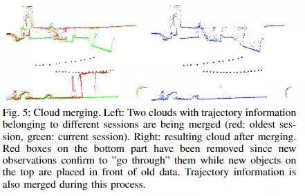 图5 云合并。 左:具有属于不同会话的轨迹信息的两个云正在合并(红色:最旧的会话,绿色:当前会话)。 右:合并后生成的云。底部的红色框已被删除,因为新的观察确认“通过”它们,而顶部的新对象放在旧数据前面。 在此过程中也会合并轨迹信息