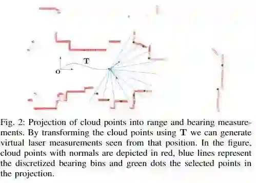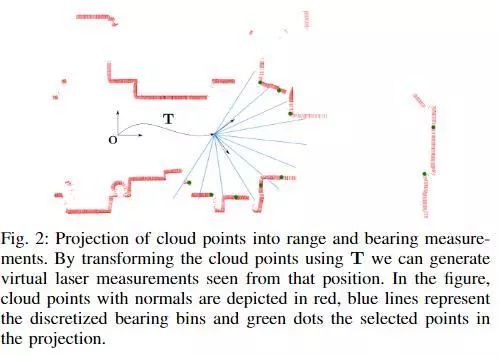 图2 将云点转为量程和方位测量。通过利用T变换云点,我们可以产生从那个位置看到的虚拟激光测量。图中,红色表示法线云点,蓝色线表示离散的承载箱,绿色点表示投影中选定的点。
