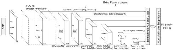 相比YOLO,SSD在卷积特征后加了若干卷积层以减小特征空间大小,并通过综合多层卷积层的检测结果以检测不同大小的目标。此外,类似于Faster R-CNN的RPN,SSD使用3×3卷积取代了YOLO中的全连接层,以对不同大小和长宽比的锚盒来进行分类/回归。SSD取得了比YOLO更快,接近Faster R-CNN的检测性能。后来有研究发现,相比其他方法,SSD受基础模型性能的影响相对较小。