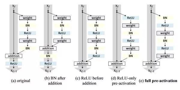 preResNet ResNet的改进。preResNet整了residual模块中各层的顺序。相比经典residual模块(a),(b)将BN共享会更加影响信息的短路传播,使网络更难训练、性能也更差;(c)直接将ReLU移到BN后会使该分支的输出始终非负,使网络表示能力下降;(d)将ReLU提前解决了(e)的非负问题,但ReLU无法享受BN的效果;(e)将ReLU和BN都提前解决了(d)的问题。preResNet的短路连接(e)能更加直接的传递信息,进而取得了比ResNet更好的性能。
