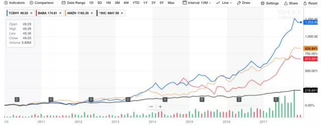 与亚马逊和纳斯达克综合指数相比,腾讯和阿里巴巴在过去 7 年的股价涨幅,资料来源:雅虎财经(2017 年 12 月 4 日)
