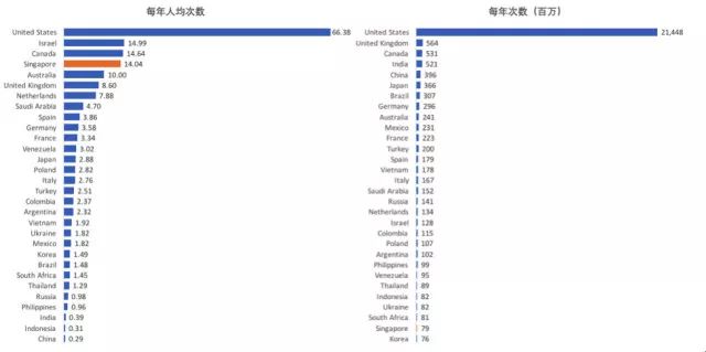 在全球范围内,就 amazon.com 的每年使用次数,新加坡人排名第 29 位,但是如果进行人口规模标准化处理后,新加坡人则排名第 4 位。新加坡平均每年每人访问 amazon.com 的次数为 14.04 次,在亚洲所有国家中排名第一。