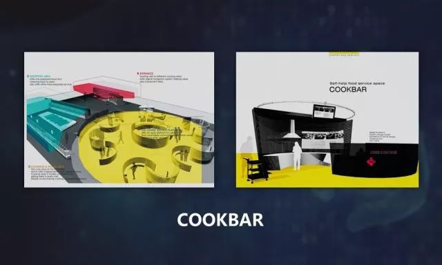 另外一个就是现在大家下班回来,不可能都去现买菜、炒菜。本世纪初我们跟香港理工大学、韩国科技大学,日本的大学一块儿做了一个课题,当时大家讨论,东方的饮食文化怎么在快餐或自助餐厅的冲击下传承下去。韩国、日本或者是香港拿来的方案都是筷子、碗的新型设计,运用高科技想象未来。而我们拿出了另一个方案,在小区里设立一个空间,各家买了菜去加工,小区里或者是亲朋好友的聚会都可以在这里,第一次用一种服务系统,等于大厨省掉了,每一个人都是大厨,刷碗不用管了,可以说是一种全新的饮食方式,我把它叫做COOKBAR。这个拿出来方案之后大家都很吃惊。在未来会出现各种各样的解决问题的方式。