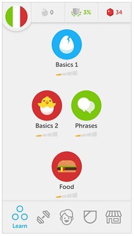 作为一个教育应用,必须让用户易于发现和易于理解它的所有内容及类别。尽管语言学习的应用程序包含大量的内容,但多邻国这个应用,仍然没有在屏幕的左侧或右侧隐藏其菜单。