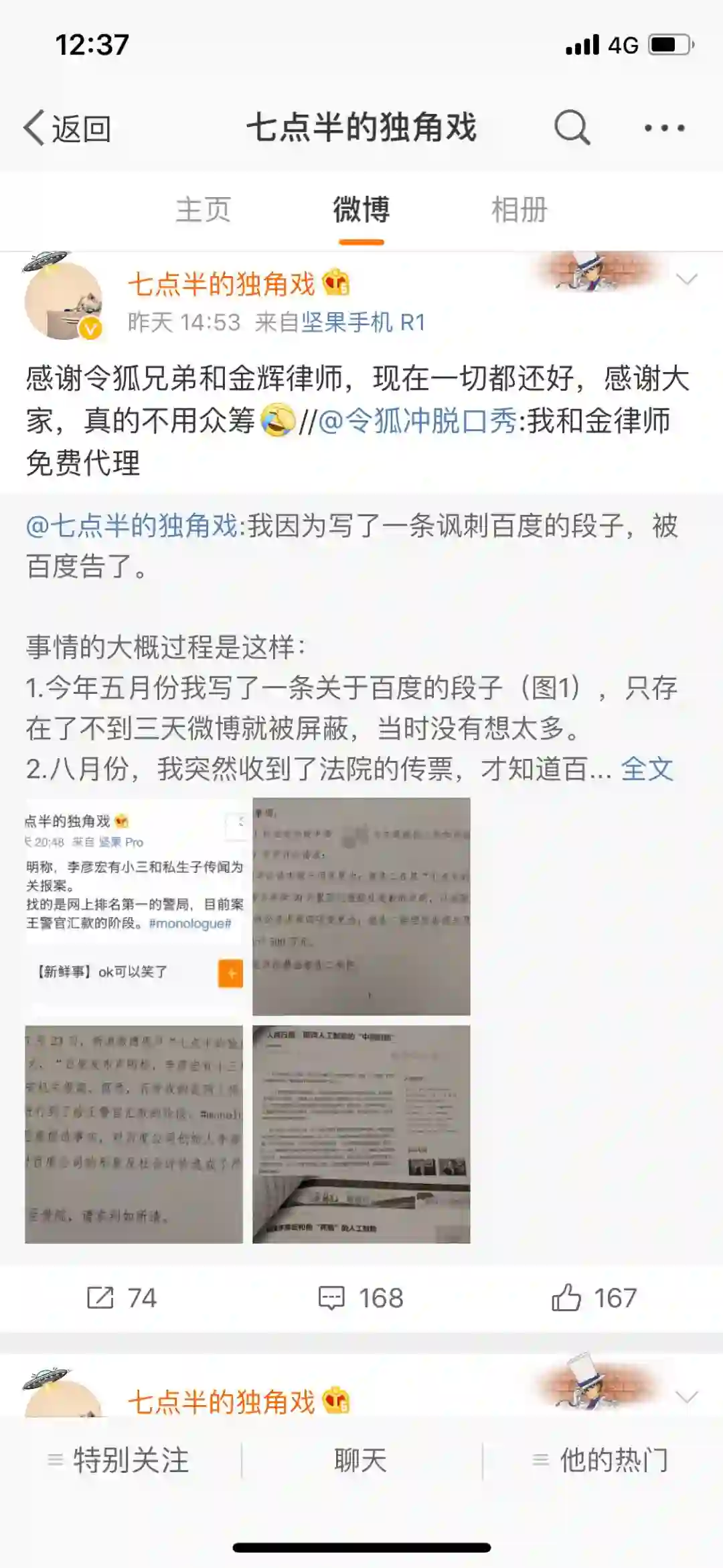今年5月,他在微博上发出的另一条关于百度的,却给他惹来了官司——