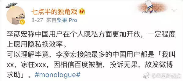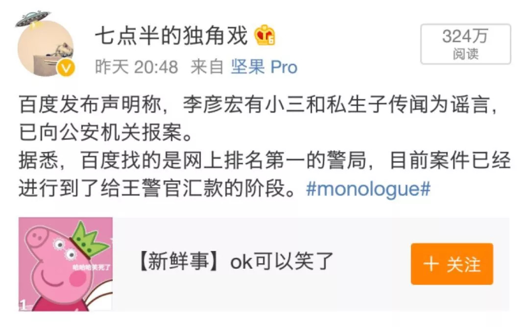 在“七点半的独角戏”看来,他发的那条微博已经加了标签“#monologue#”,这个标签是美式脱口秀的一个环节,表示这条段子的基本特征就是前半句是新闻事实,后半句是对它的讽刺和调侃。
