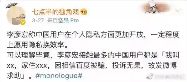 据了解,这条微博三天内就被屏蔽。8月初,“七点半的独角戏”收到法院传票,百度以侵犯名誉权为由将其告上法庭,索赔人民币500万元,并要求在他微博首页连续30天置顶道歉声明。