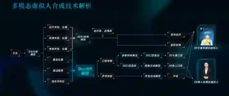 进一步,俞栋博士向大家展示了多模态技术的阶段性成果——虚拟人的合成技术流程:系统首先从文本中提取各种各样的信息,包括动作、表情、情感、重音位置、和激动程度等;之后将这些信息输入到动作表情模型生成动作和表情,同时输入给多模态合成系统 DurIAN 同步生成语音以及口型和表情参数,进而合成真人或者卡通形象。