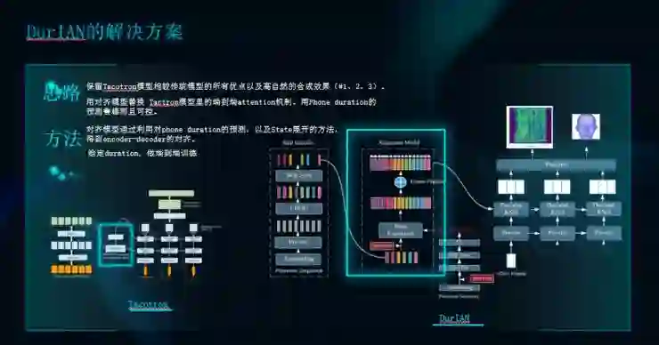 基于对端到端语音合成模型 Tacotron 出现漏词、重复等问题的原因的发现,俞栋博士团队在 DurIAN 模型中提出了解决方案,即保留 Tacotron 模型中对语音合成的自然度有益的部分,也就是上述提到的前三个改进部分,然后使用时长预测模型来替换端到端注意力机制。其基本做法是训练一个音素时长预测模型,然后在给定时长的情况下,对模型进行端到端训练。