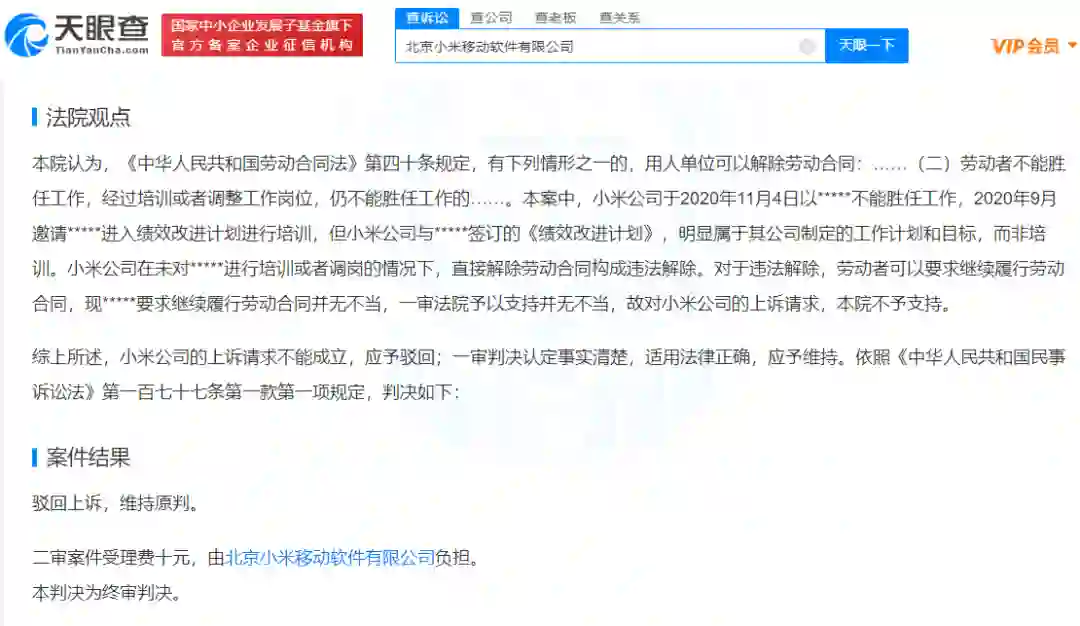 【小米辞退不能胜任工作员工终审败诉】近日,北京法院审判信息网公开小米与前员工何某相关劳动争议二审判决结果,北京市第一中级人民法院维持一审原判,小米需与何某继续履行劳动合同。此前一审法院认为,小米在未对何某进行培训或者调岗的情况下,直接解除劳动合同构成违法解除。(九派新闻)