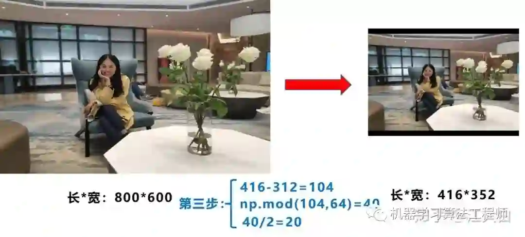 但是有的同学可能会有大大的问号??如何进行计算的呢?大白按照Yolov5中的思路详细的讲解一下,在datasets.py的letterbox函数中也有详细的代码。