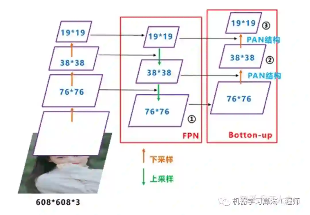 以网络的输入608*608为例,yolov3、yolov4,yolov5中下采样都使用了5次,因此最后的特征图大小是19*19,38*38,76*76。