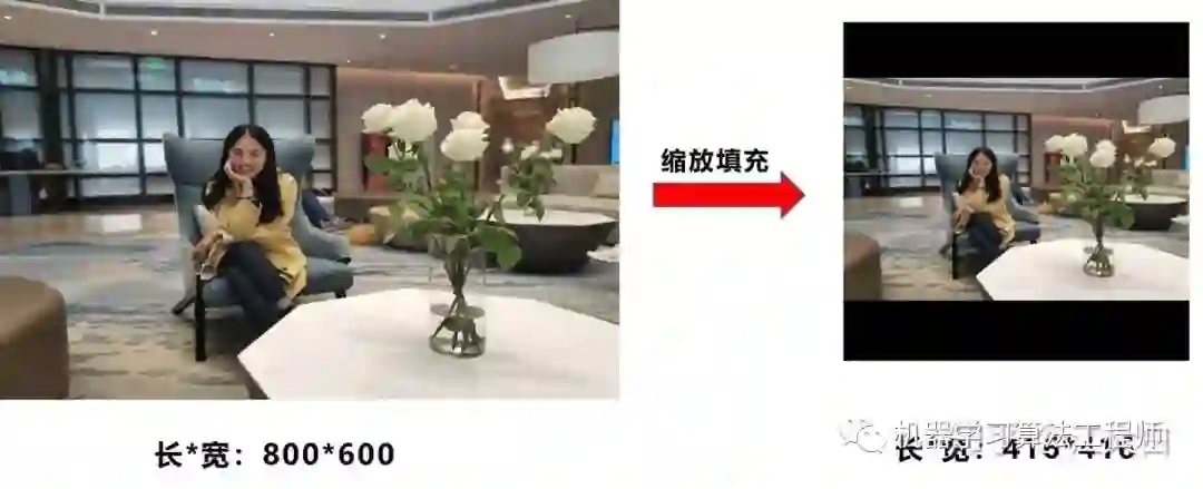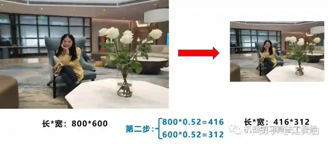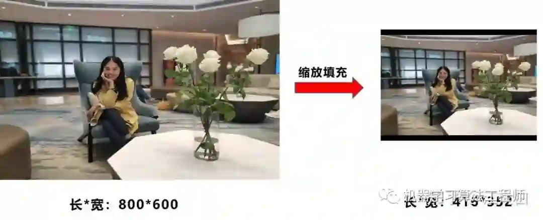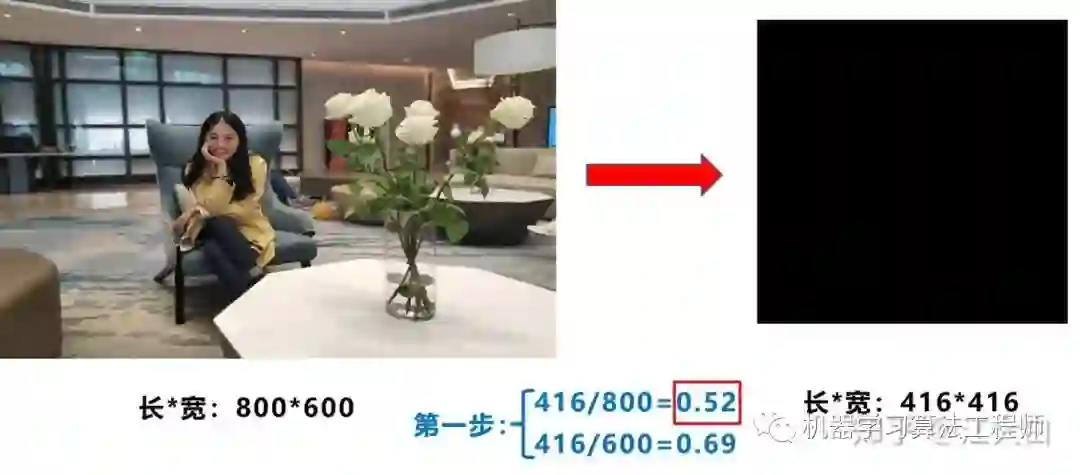 原始缩放尺寸是416*416,都除以原始图像的尺寸后,可以得到0.52,和0.69两个缩放系数,选择小的缩放系数。