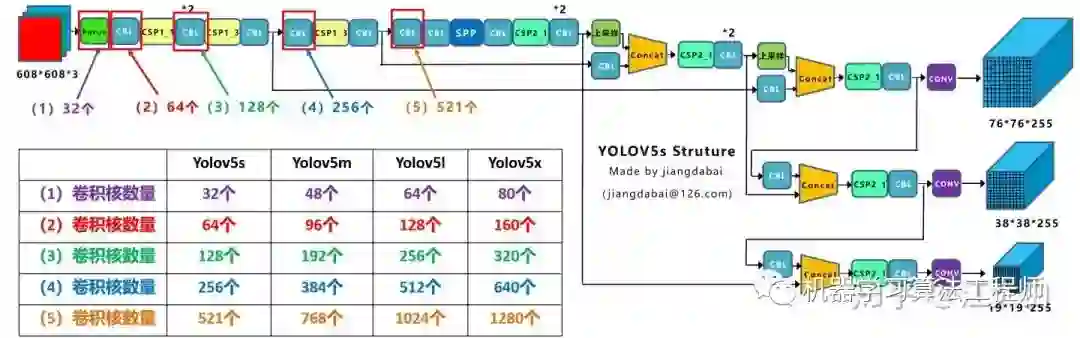 四种不同结构的卷积核的数量不同,这也直接影响网络中,比如CSP1,CSP2等结构,以及各个普通卷积,卷积操作时的卷积核数量也同步在调整,影响整体网络的计算量。
